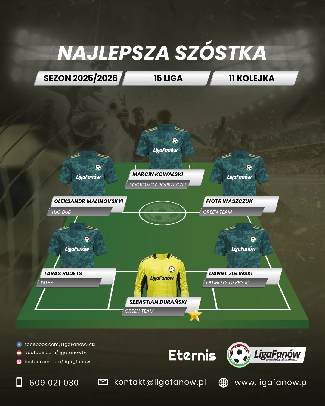 Dla Green Teamu to chyba nareszcie „ten sezon”, jak mawia stare piłkarskie porzekadło – wszakże trudno nie odnieść innego wrażenia wobec tak solidnej gry i regularnego punktowania. Sposób, w jaki ekipa Roberta Zawistowskiego rozprawiła się z młodym, aspirującym do strefy medalowej Szeregiem Homogenizowanym również nie był dziełem przypadku. Pomimo dość okazałego rozmiaru zwycięstwa, wcale nie było tak „lekko i przyjemnie” – szczególnie w pierwszej odsłonie zmagań, gdy zawody te były bardzo wyrównane, Zielonych trzymał przy życiu Sebastian Durański. Doświadczony golkiper był bardzo pewnym punktem swojego zespołu, wywiązując się ze swych obowiązków na linii i w polu bramkowym bez zarzutu. Ileż to razy oczami wyobraźni było już widać piłkę trzepoczącą w siatce, kiedy to w ostatniej chwili instynktowną interwencją rodem z wyższych lig popisywał się Durański. Na największą pochwałę zasługują jego parady bramkarskie przy okazjach Szeregu z naprawdę niewielkich odległości – jak na prawdziwego lidera przystało, Sebastian zawsze stał na posterunku, gdy jego drużyna tego potrzebowała. Bezbłędny w powietrzu, niesamowity na linii oraz co ciekawe i dość nietypowe wśród bramkarzy na tym poziomie rozgrywkowym – niezwykle spokojny w rozegraniu piłki. Postawa Sebastiana w tym meczu zapewniała jego kolegom cenny komfort, dzięki któremu mogli oni skupić się na ofensywnych wyczynach i pieczętowaniu wygranej. To już kolejne spotkanie, kiedy ów bramkarz „rzuca się w oczy” za sprawą swojego występu, tak więc decyzją sztabu Ligi Fanów to właśnie w jego ręce wędruje tytuł MVP jedenastej serii gier w 15. Lidze – pierwszy taki laur w karierze tego zawodnika na naszych boiskach. Sebastianowi serdecznie gratulujemy dostąpienia tak zaszczytnego wyróżnienia i życzymy, no cóż – by ta jego świetna dyspozycja przyniosła Green Teamowi upragnione medale. Brawo!