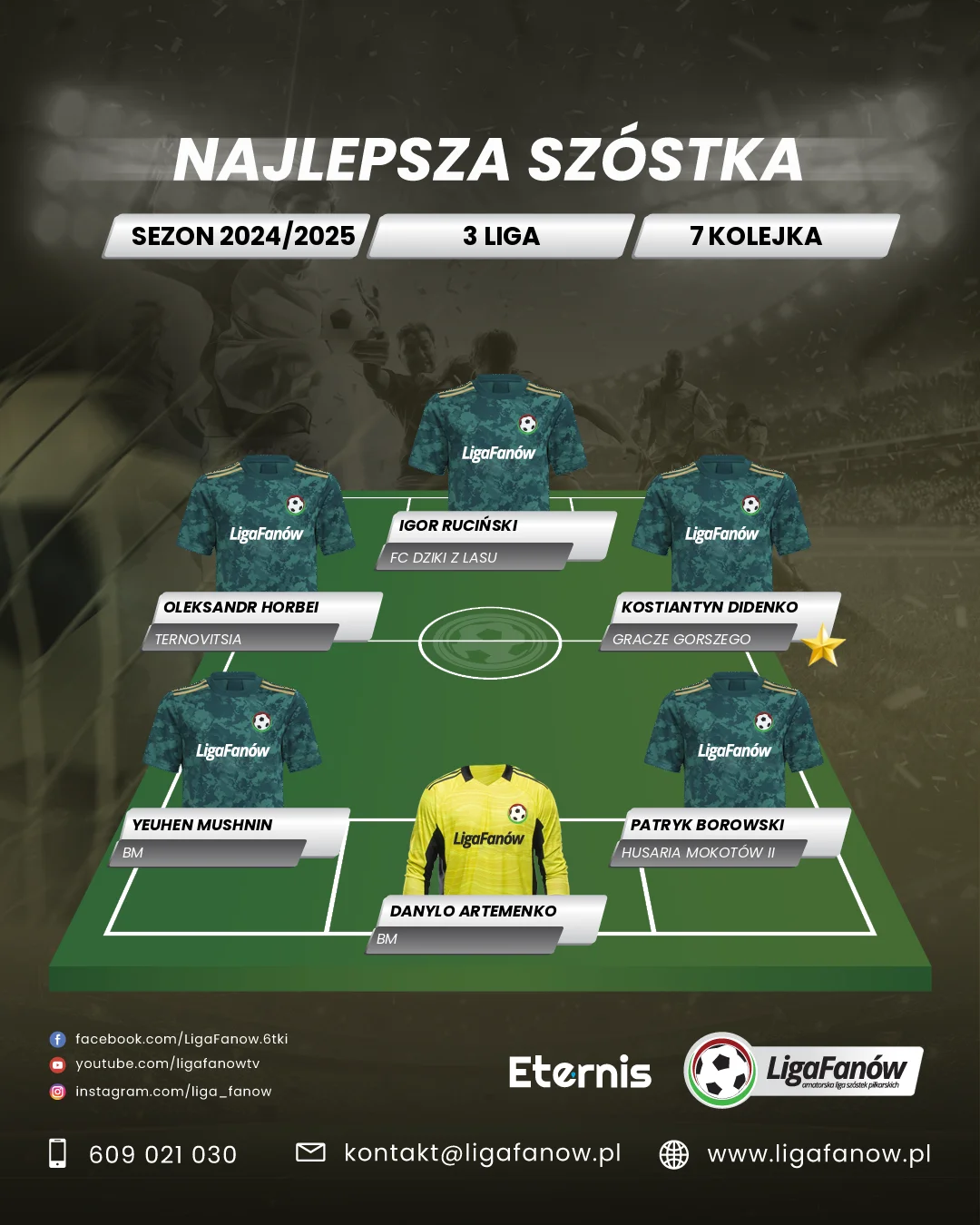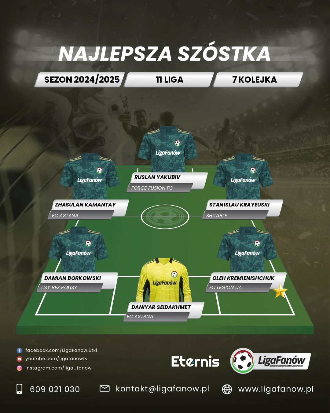 Oleh Kremienishchuk zasłużył na tytuł MVP 7. kolejki Ligi Fanów dzięki fenomenalnemu występowi, który poprowadził FC Legion UA do zwycięstwa 7:5 nad Borowikami. Jego obecność na boisku była w naszej ocenie decydująca. Jego statystyki to aż trzy bramki, a także dorzucił do tego asystę, wykazując się nie tylko skutecznością, ale też inteligencją w grze i umiejętnością kreowania akcji dla kolegów z zespołu. To właśnie Oleh kontrolował tempo ofensywy Legionu, wielokrotnie angażując się w akcje kluczowe dla ostatecznego wyniku. Jego wyczucie pozycji, precyzja i chłodna głowa pod bramką przeciwnika były na najwyższym poziomie, co sprawiało, że obrona Borowików miała ogromne trudności z zatrzymaniem go. Oleh wykazał się nie tylko indywidualnymi umiejętnościami, ale także zespołowym podejściem, umiejętnie włączając innych zawodników do gry i tworząc kolejne okazje strzeleckie. Dzięki takiemu zaangażowaniu i skuteczności napastnik Legionu zdominował mecz, wyróżniając się jako lider, na którego zespół mógł liczyć w kluczowych momentach. Po siedmiu kolejkach ten zawodnik ma już 9 bramek i 6 asyst, co pokazuje, jak ważną rolę pełni w drużynie i dlaczego jest jednym z najlepszych zawodników w lidze.