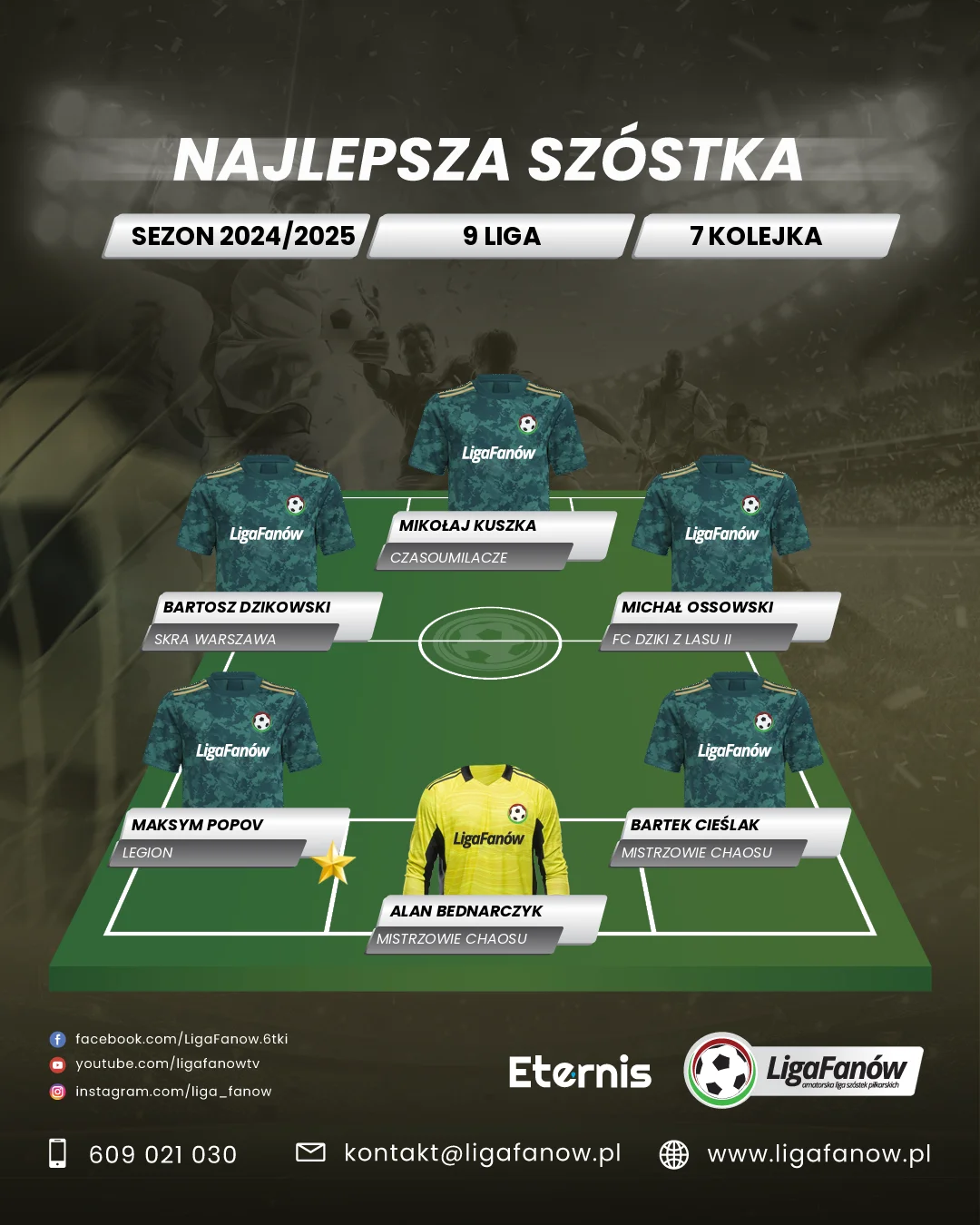 Drużyna Legionu dość gładko pokonała zespół FC Polska Górom, a nam najbardziej podobała się gra Maksyma, który miał duży wpływ na sukces swojego teamu. Mecz ten nie przebiegłby w taki sposób, gdyby nie jego świetna dyspozycja. Maksym to dynamiczny i wszechstronny zawodnik, który wyróżnia się doskonałym instynktem strzeleckim i w siódmej kolejce ponownie był nie do zatrzymania strzelając trzy bramki dla swojego zespołu. Dzięki świetnej technice, szybkości i zwinności, potrafi zarówno wykańczać akcje, jak i kreować sytuacje bramkowe dla kolegów. Jest niesamowicie trudny do upilnowania, wykonuje dużo ruchów bez piłki, czym często gubi rywala i defensywa rywali musi się sporo natrudzić by powstrzymać tego gracza. Maksym jest znany również ze swojej determinacji. Dla tego zawodnika nie ma straconych piłek. Jest prawdziwym liderem na boisku i w tej kolejce to udowodnił. Głównie dzięki jego fenomenalnej postawie gracze Legionu mogli cieszyć się z kompletu punktów. Gratulujemy niezwykle udanego meczu i czekamy na kolejne, równie dobre w jego wykonaniu.