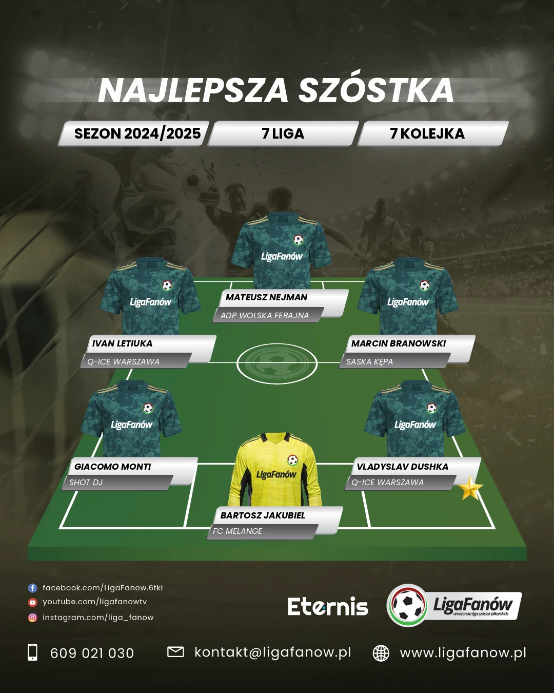 Siedem kolejek drużyna Q-Ice Warszawa czekała, aby zdobyć swoje premierowe punkty w naszych rozgrywkach. W siódmej kolejce ta sztuka się udała, a zawodnikiem, który był głównym architektem zwycięstwa był Vladyslav Dushka. Praktycznie całe spotkanie mobilizował swoich kolegów do wysiłku często stosując pressing już na połowie rywala. Przy niekorzystnym wyniku mając dwubramkowy deficyt dał sygnał do odrabiania strat strzelając gola kontaktowego. Był bardzo aktywny na boisku i w kluczowych momentach potrafił również znakomicie odnaleźć się w defensywie swojego zespołu. W całym meczu Vladyslav zdobył dwa gole, które padły w kluczowych momentach meczu. Do swoich statystyk dopisał jeszcze asystę i to w tym sezonie jest jego najlepszy bilans z pośród wszystkich występów w rundzie jesiennej. Jego umiejętności i zaangażowanie przykuły naszą uwagę i sprawiły, że swoją ciężką pracą zasłużył na tytuł najlepszego zawodnika 7 ligi. Gratulujemy tytułu MVP i liczymy, że następne występy Vladyslava będą na podobnym poziomie, co z pewnością przełoży się na wyniki jego zespołu.