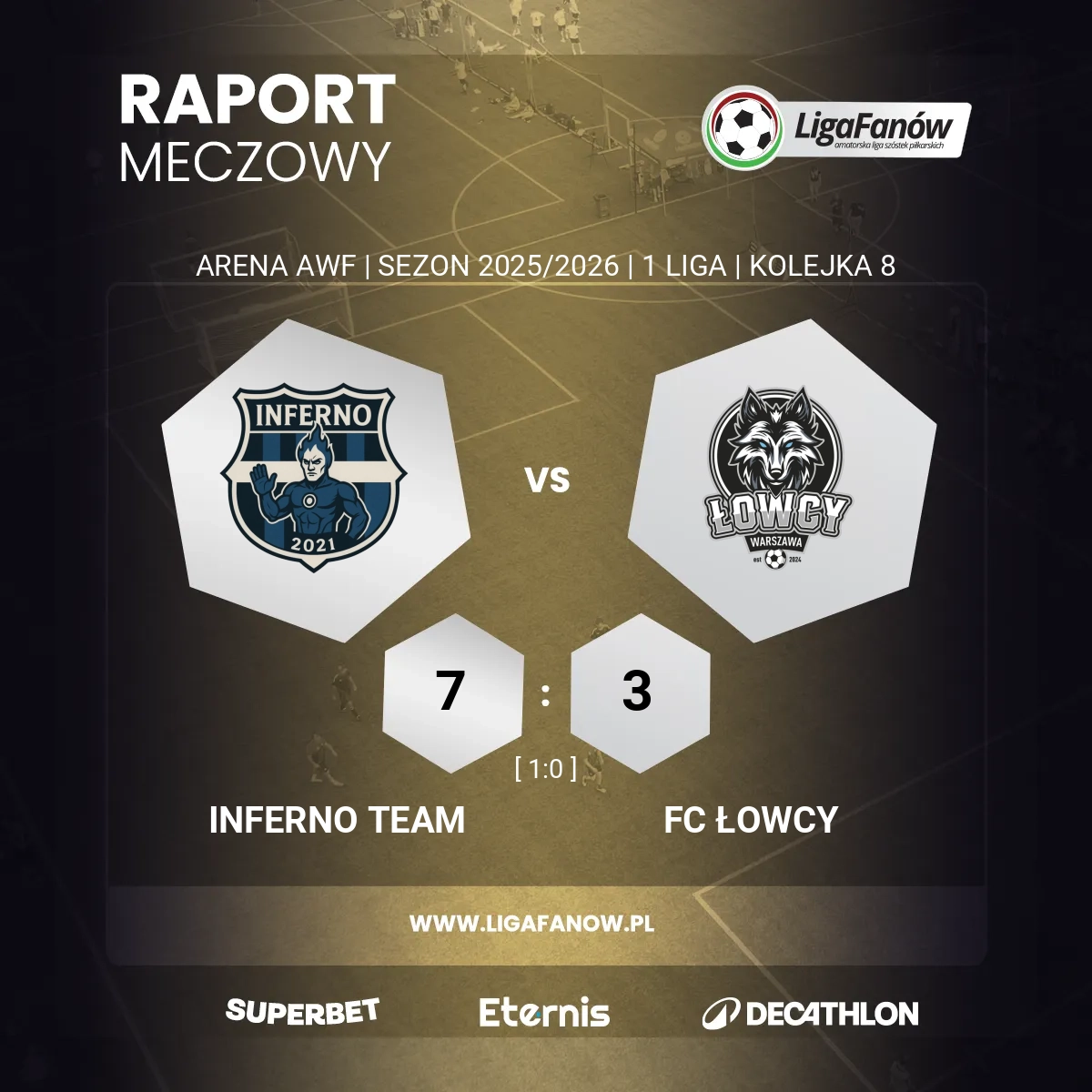 Ostatecznie w meczu na szczycie 1. Ligi Fanów Inferno Team zasłużenie pokonało FC Łowcy 7:3.