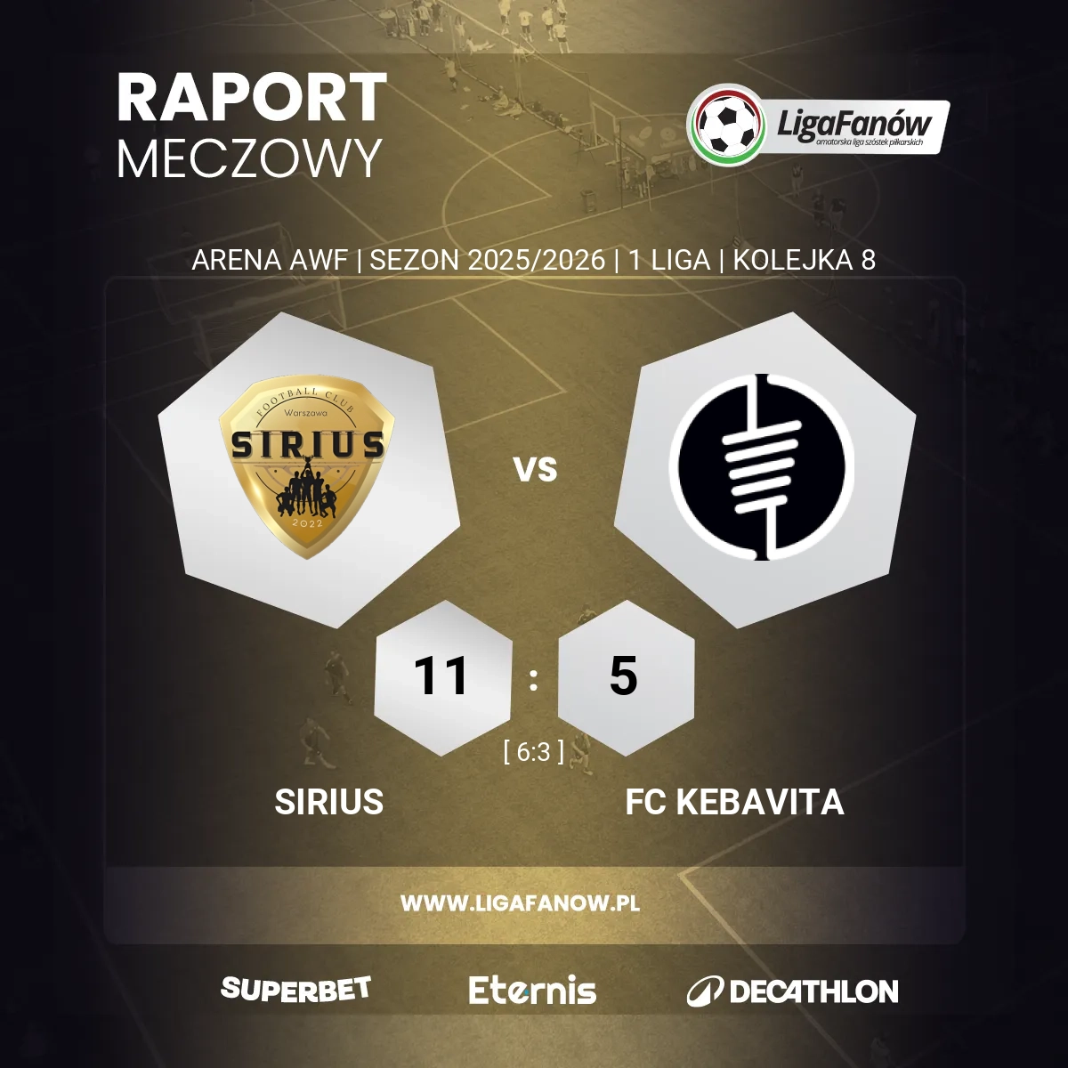 Mecz rozpoczął się zaskakująco dobrze dla ekipy Buraka Cana. Mocnym strzałem po długim słupku Dima Kaszuba zaskoczył bramkarza rywali. To trafienie zadziałało jednak motywująco na gospodarzy, którzy od tego momentu zaczęli grać swoją piłkę i przejęli całkowitą kontrolę nad spotkaniem. O ile w pierwszej odsłonie aż sześć razy ktoś z ekipy Siriusa wpisywał się na listę strzelców, a goście odpowiedzieli trzykrotnie. O ile ten wynik nie był jeszcze tragiczny dla Kebavity, o tyle druga połowa to już kompletna dominacja faworytów.