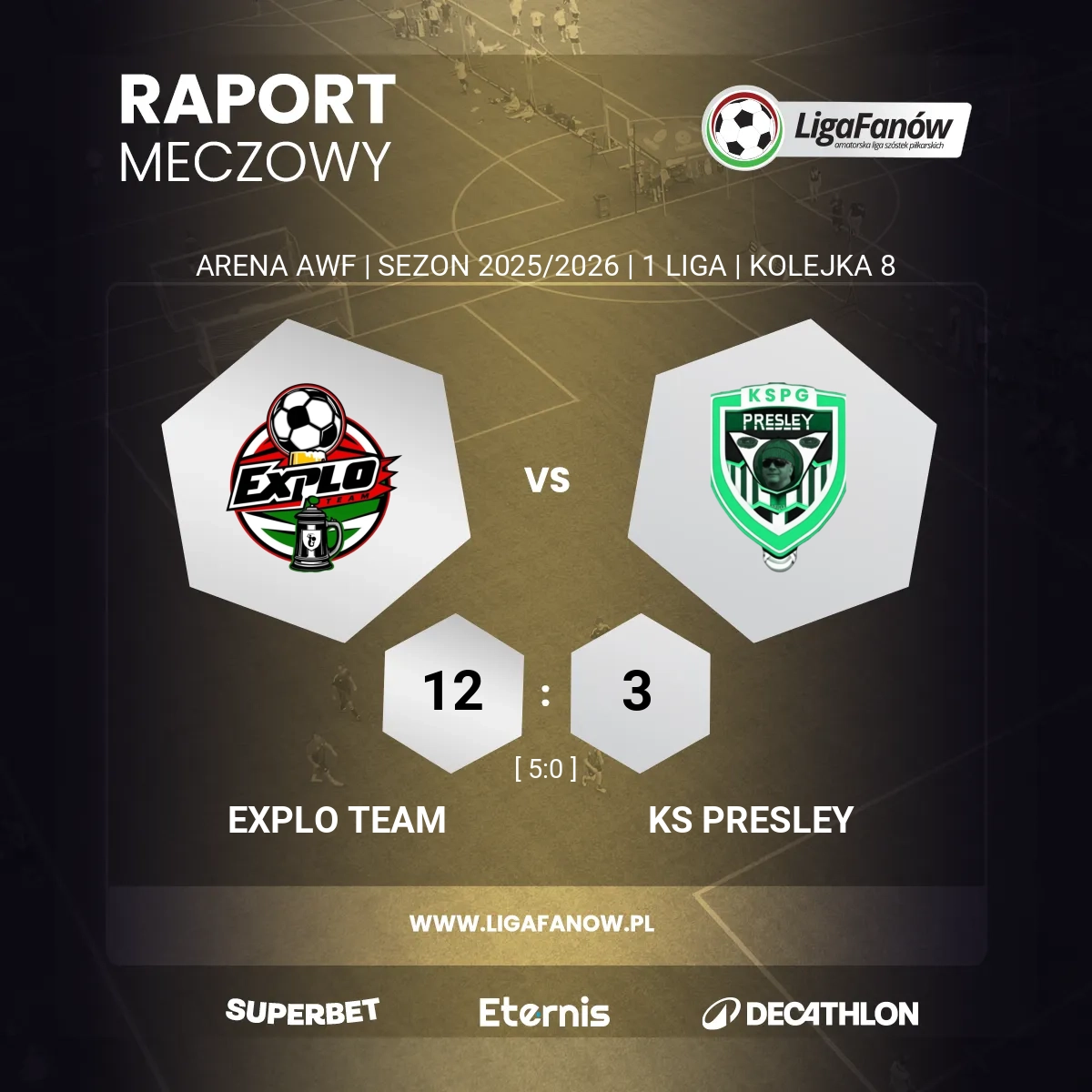Ostatecznie Explo Team zwyciężył aż 12:3, zgarniając pewne trzy punkty i pokazując, że w tym sezonie może być groźny dla każdej drużyny. Presley Gniazdowy, mimo trudnego początku i gry w osłabieniu, walczył do końca, lecz różnica klas i skuteczności była w tym meczu wyraźna.