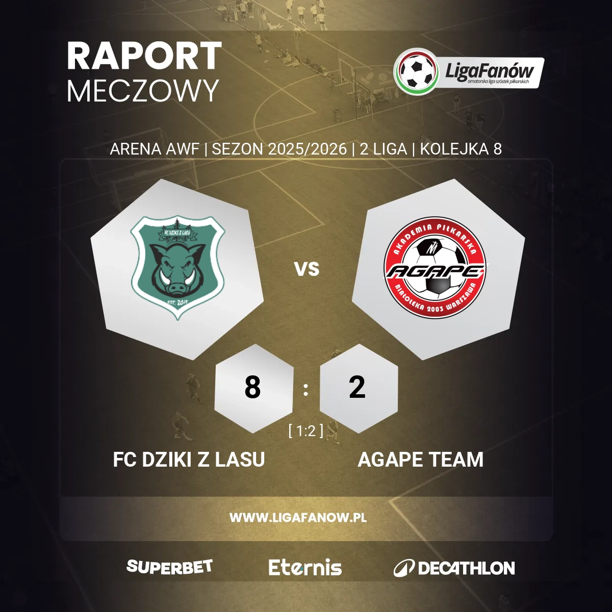 Dziki z Lasu spokojnie zrealizowały plan, jakim było zdobycie kompletu punktów z zamykającym tabelę AGAPE Team, choć trzeba przyznać, że goście nie poddali się bez walki. Mało tego, wykorzystując kilka błędów gospodarzy, zawodnicy w białych koszulkach schodzili na przerwę prowadząc 1:2. Świetne zawody rozgrywał Vladyslav Martynov - najpierw z ostrego kąta pokonał Kamila Wiktorowicza, a pod koniec połowy asystował Michałowi Adamowskiemu. Swoje do wyniku dorzucił też Hubert Kałucki, który m.in. obronił sytuację sam na sam.