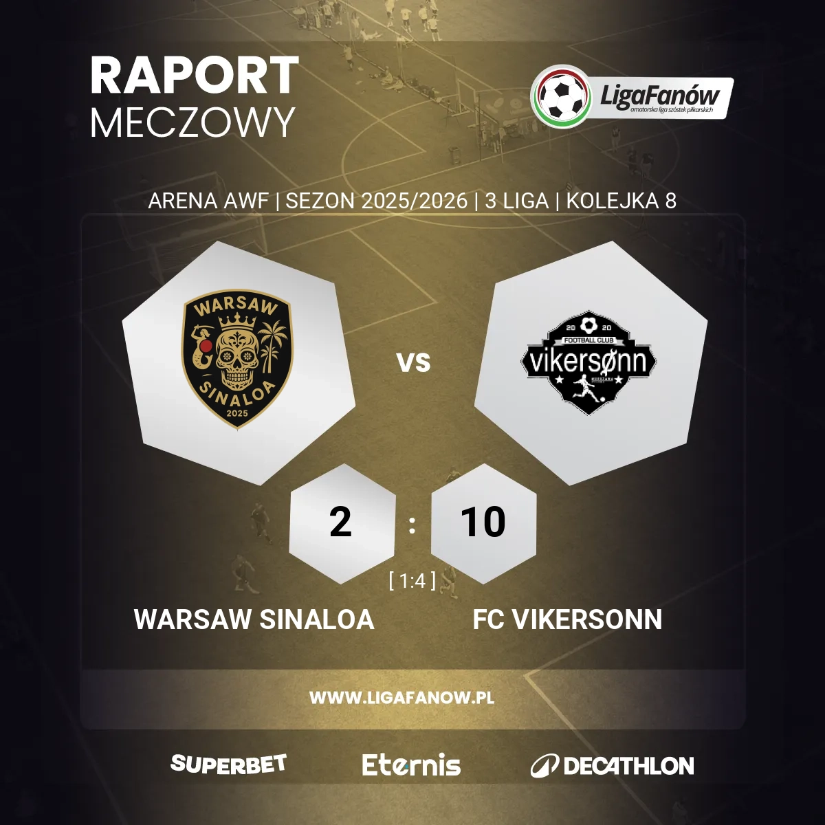 Warsaw Sinaloa próbowała jeszcze odgryzać się kontratakami i w końcówce odpowiedziała jednym trafieniem - znów za sprawą aktywnego Nejmana, tym razem po właściwej stronie boiska. Chwilę później sędzia zakończył mecz, a ponieważ wcześniej goście dołożyli jeszcze dwa gole, Vikersonn UA I zwyciężył bardzo pewnie 10:2, potwierdzając swoją wysoką formę i umacniając się w czołówce tabeli.