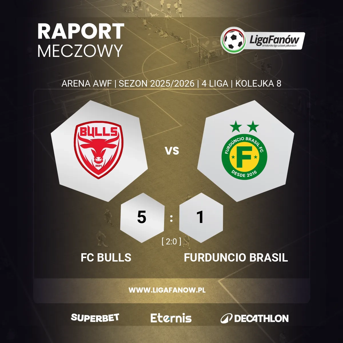 W ramach ósmej kolejki Ligi Fanów na najwyższym szczeblu rozgrywkowym spotkały się drużyny zajmujące miejsca w strefie spadkowej. Ekipa FC Impuls UA podejmowała zespół FC Lakoksy. Było to starcie dwóch beniaminków, którym dotychczas udało się wygrać zaledwie dwa spotkania, co z pewnością jest dla obu drużyn sporym niedosytem. Niedzielny mecz wydawał się przysłowiowym starciem o sześć punktów, dlatego spodziewaliśmy się ciekawego widowiska.