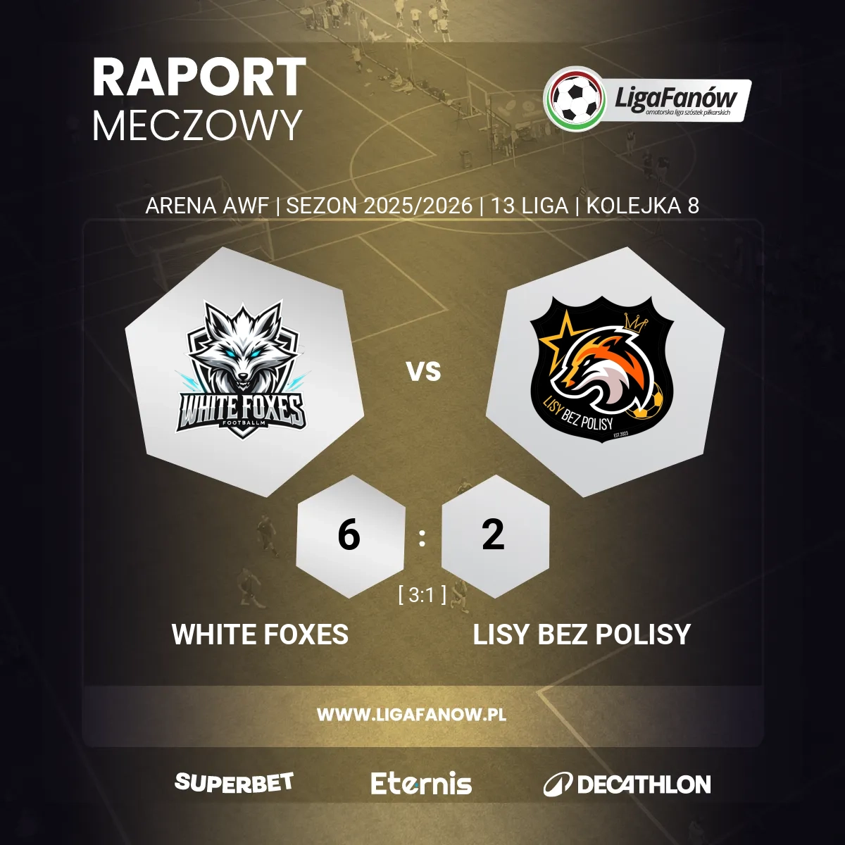 O godzinie 9:00 na Arenie AWF zmierzyły się ekipy White Foxes i Lisy Bez Polisy. Faworytem w derbowym starciu „lisów” był zespół gości, który plasował się o dwie lokaty wyżej i posiadał znacznie lepszy bilans bramkowy od swoich niedzielnych rywali. Nim pierwszy gwizdek zdążył porządnie wybrzmieć, gospodarze wyszli na prowadzenie za sprawą trafienia swojego asa, Jakuba Sokołowskiego.