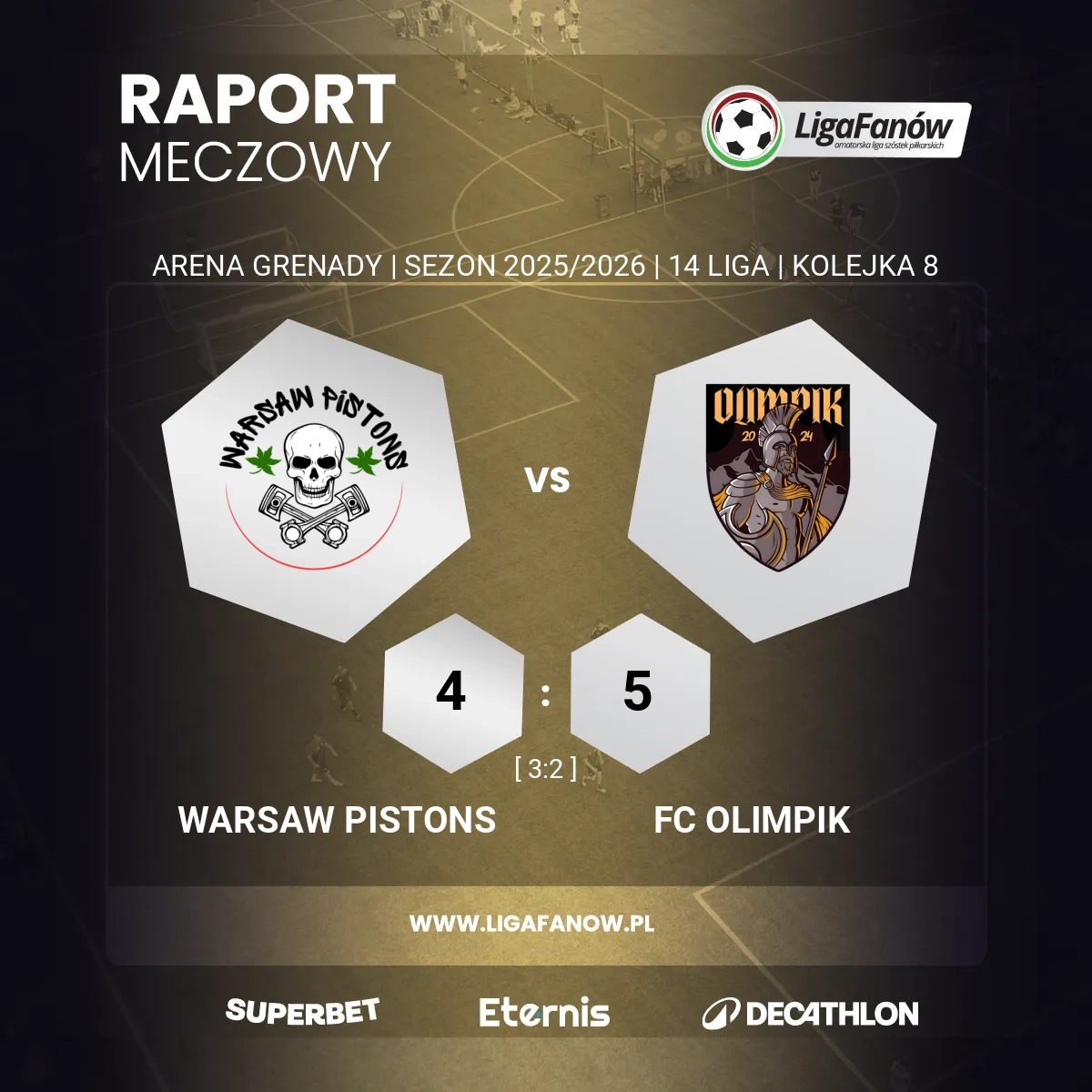Spotkanie pomiędzy zespołami Warsaw Pistons a FC Olimpik zapowiadało się jako niezwykle wyrównane, z uwagi na zbliżoną pozycję obu ekip w tabeli. Lepiej w mecz weszli gospodarze, którzy otworzyli wynik za sprawą trafienia Filipa Reńca. Długo jednak nie cieszyli się z prowadzenia, ponieważ goście szybko doprowadzili do wyrównania.