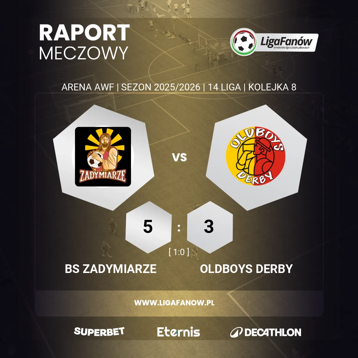 Prawdziwy mecz na szczycie 14. Ligi rozegrał się pomiędzy zespołem niepokonanych od sześciu kolejek BS Zadymiarzy a „dwójką” Oldboys Derby. Goście, jak to mają w zwyczaju, skupili się na defensywie, pozostawiając całą ofensywną inwencję bramkostrzelnemu Łukaszowi Łukasiewiczowi, który już w pierwszych minutach zmusił Kubę Szymborskiego do kilku interwencji. Jednak to dominujący z piłką przy nodze gospodarze jako pierwsi wyszli na prowadzenie - podanie za plecy obrońców od Szymona Fabisiaka wykorzystał Dominik Zawiślak.