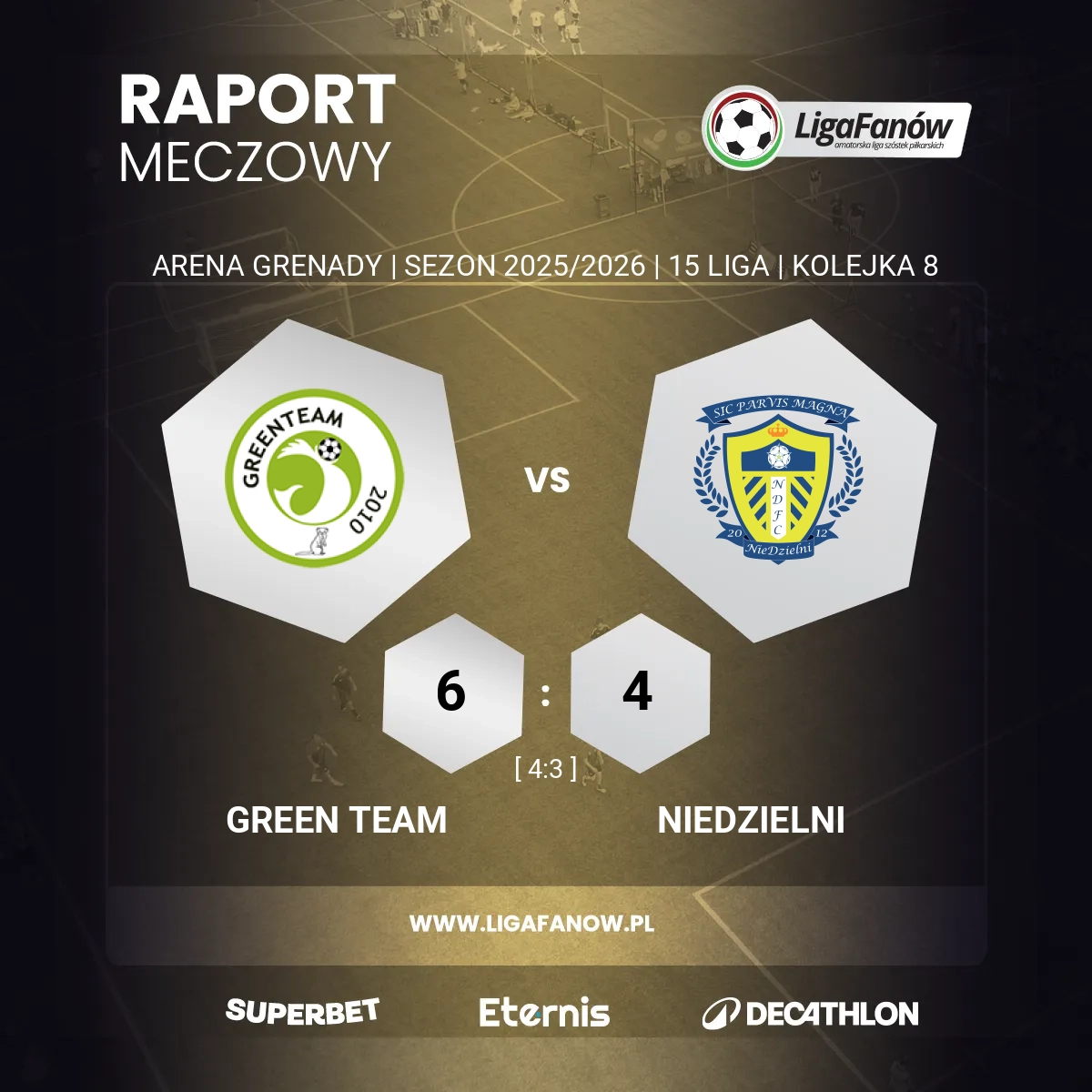 Green Team zdołał jednak opanować sytuację. Piotr Waszczuk popisał się precyzyjnym uderzeniem z rzutu wolnego, a chwilę później gospodarze podwyższyli wynik na 3:1. Wydawało się, że mecz zaczyna układać się zgodnie z przewidywaniami, ale Niedzielni nie odpuszczali i przed przerwą zmniejszyli straty, schodząc do szatni przy stanie 4:3, co zapowiadało naprawdę ciekawą drugą odsłonę.