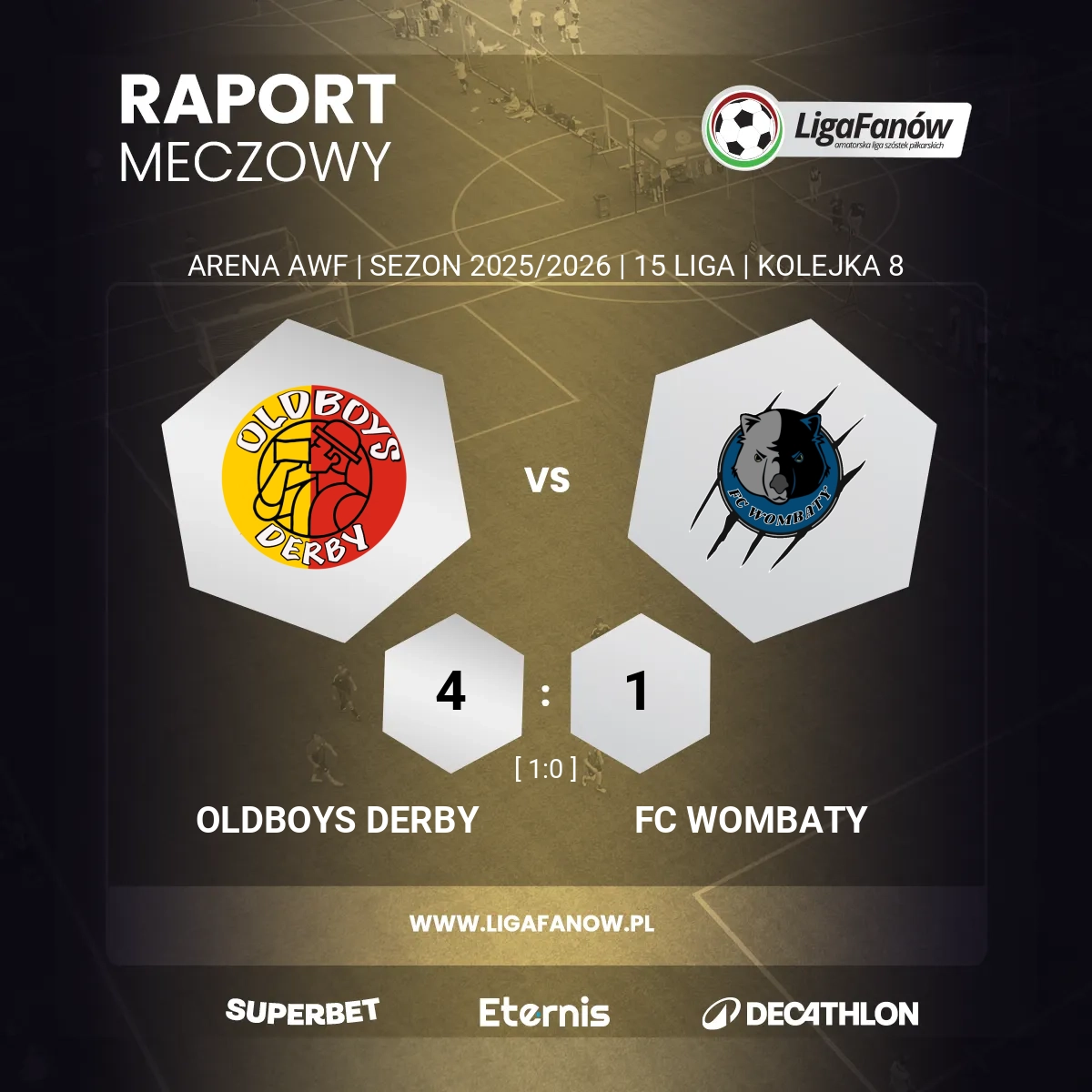 Mecz aspirujących do podium 15. Ligi Oldboyów z Wombatami, którzy od początku rundy znajdują się w strefie spadkowej, zgodnie z przewidywaniami nie miał większej historii. Bez większych taktycznych filozofii obie ekipy próbowały korzystać ze swoich największych atutów. Gospodarze bronili całym zespołem, raz po raz licząc na indywidualny geniusz Łukasza Łukasiewicza, natomiast FC Wombaty wykorzystywali przewagę motoryczną i pojedynki jeden na jednego.
